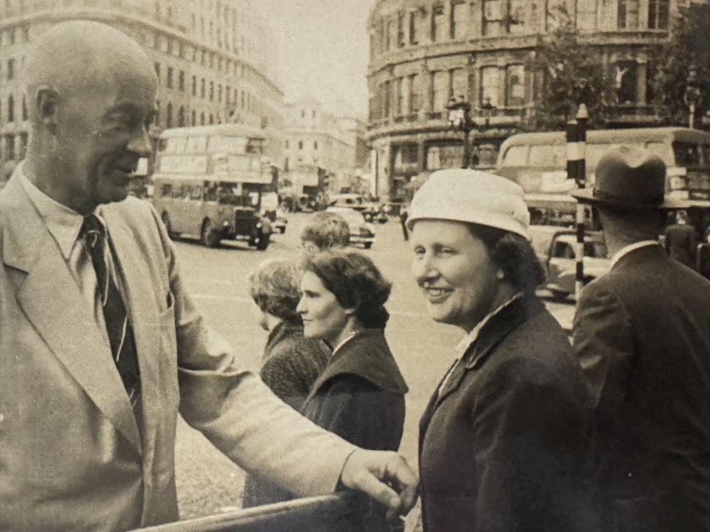 Once in London he was due to meet Joan for a drink. Joan tells the story of sitting at a table with two glasses of sherry waiting for my father to arrive. She saw this man with a bald head entering the restaurant and knew that this was him. He must have recognised her or perhaps they had some particular signal so he came over and sat down. She said she couldn’t help laughing because one arm of his glasses had broken off so he’d kept the glasses in place with a bit of string tied to a blazer button which hung behind his ear.